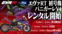 エヴァンゲリオンレーシングとレンタル819のコラボレーション企画第1弾として、「エヴァRT 初号機 パニガーレV4」が期間限定で展示・レンタルされます。横浜での展示から始まり、その後は実際に乗って楽しめるチャンスも!